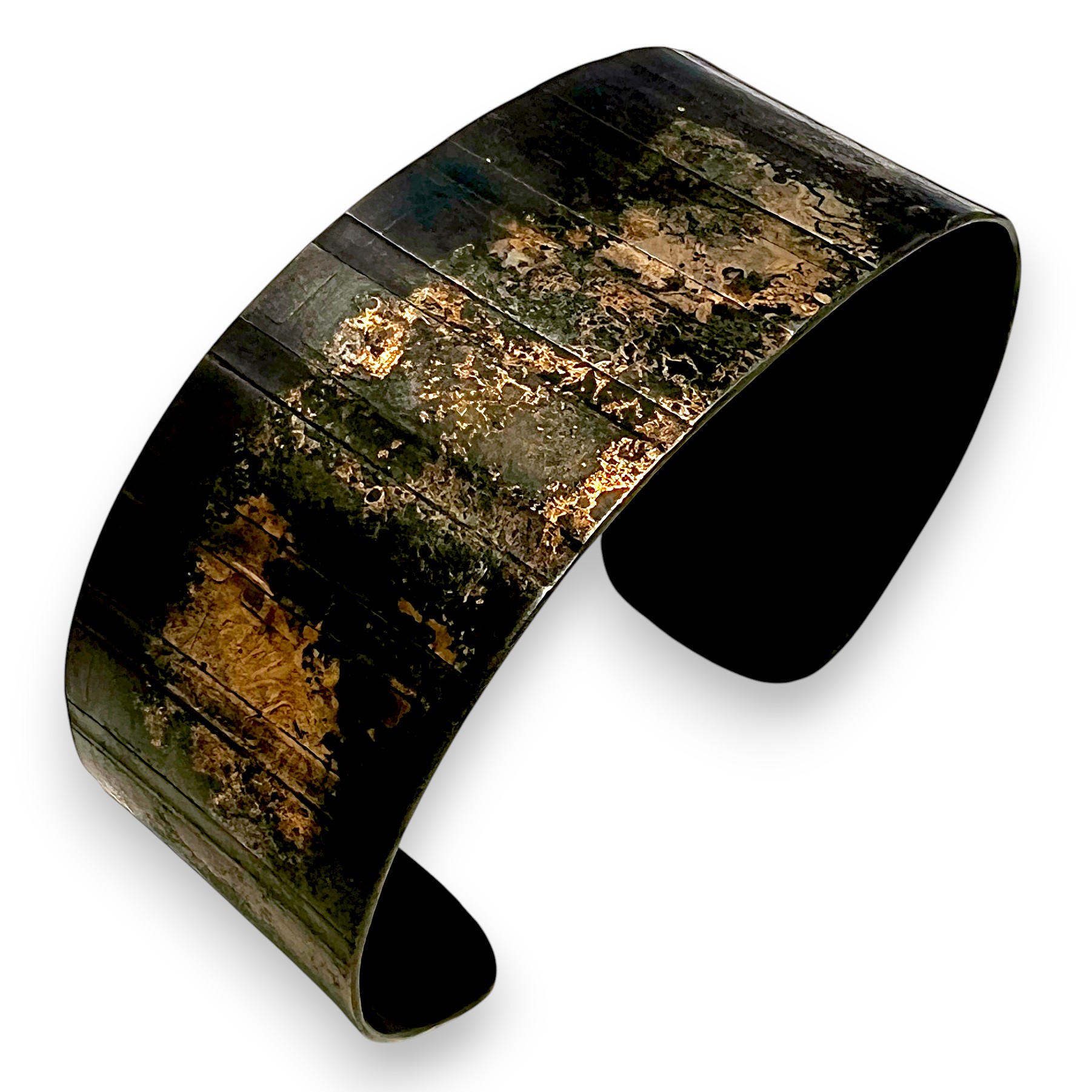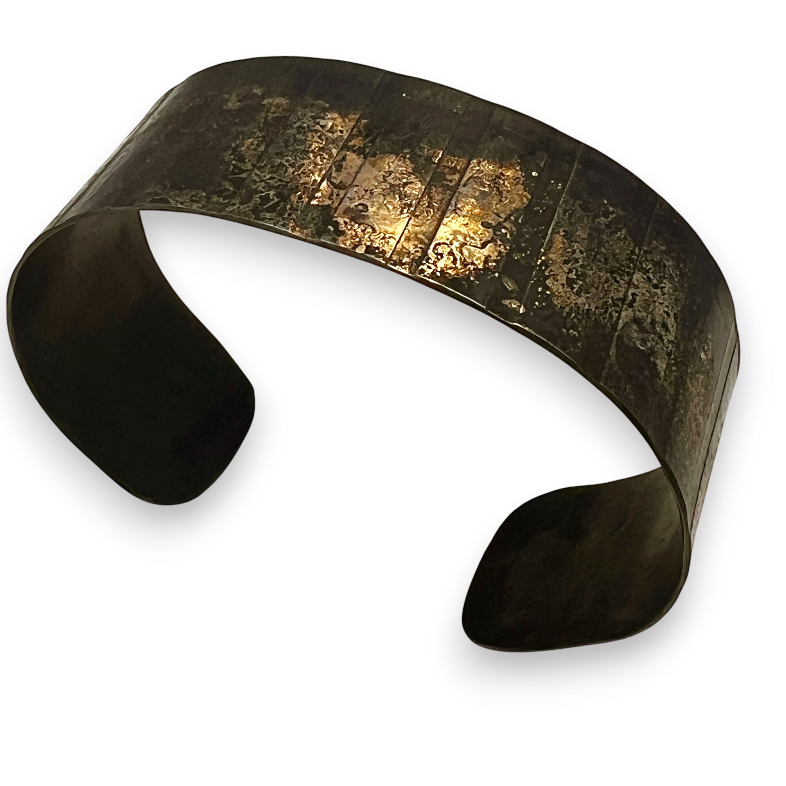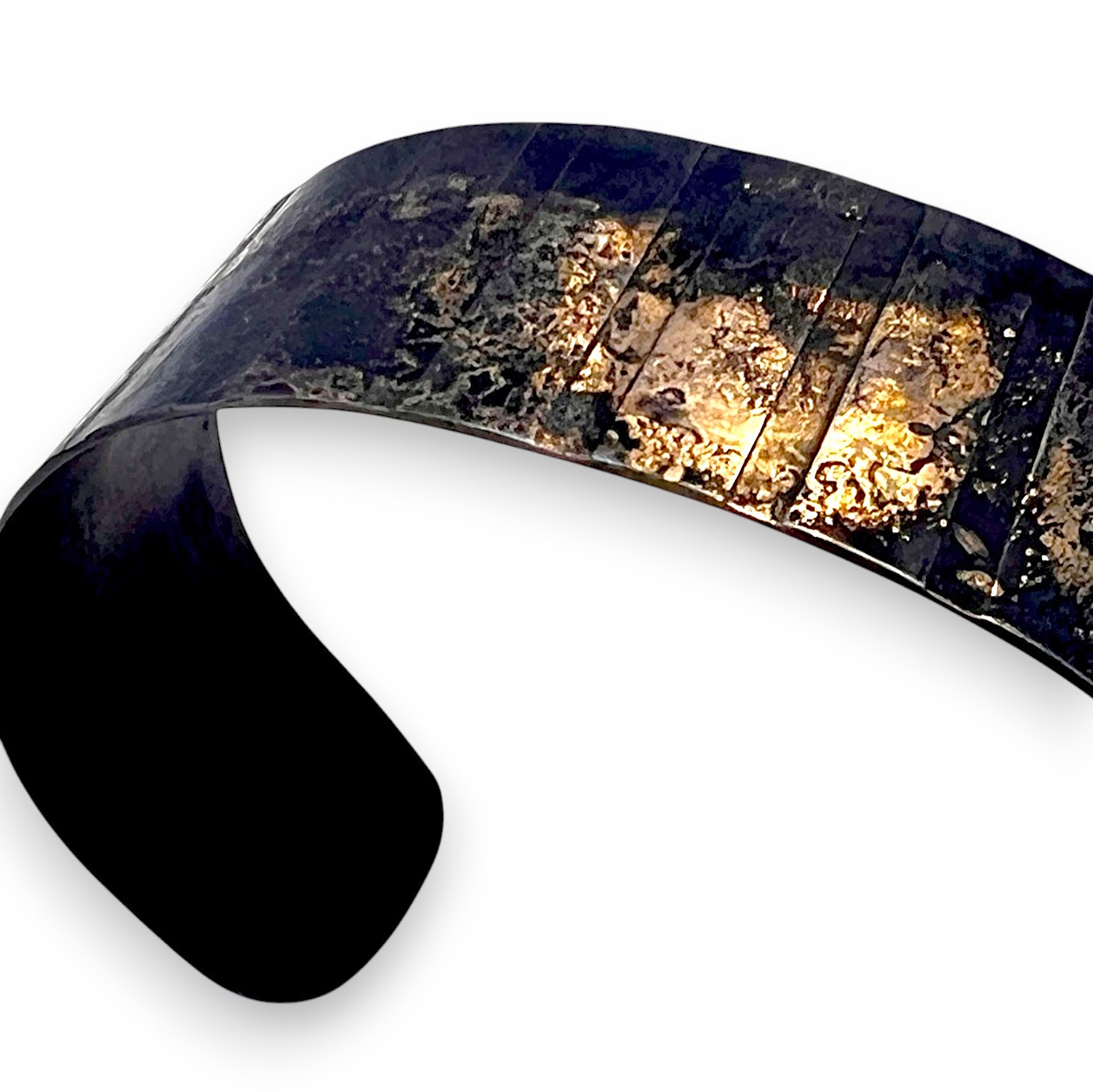 Part of the Chikara Collection, this cuff speaks to strength through rhythm, repetition, and restraint. Formed in steel and designed to fit an generous 8" wrist, the 1" wide band is deeply patterned with a linear roller texture that moves steadily across the surface, creating a sense of cadence and measured force. A deep black patina settles into the lines, amplifying their depth and giving the steel a quiet, architectural presence. Areas of 18k yellow gold are fused directly into the surface, appearing as restrained flashes of warmth against the darkness—embedded rather than applied.Substantial, intentional, and quietly commanding, this cuff is for collectors drawn to process-driven work where strength is revealed through structure, discipline, and material honesty. (Hibiki=reverberation, reverberation)