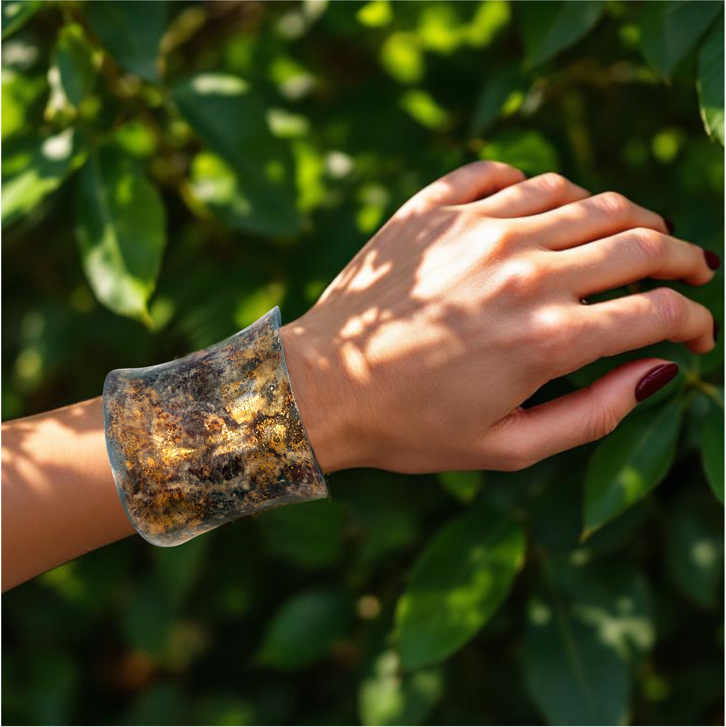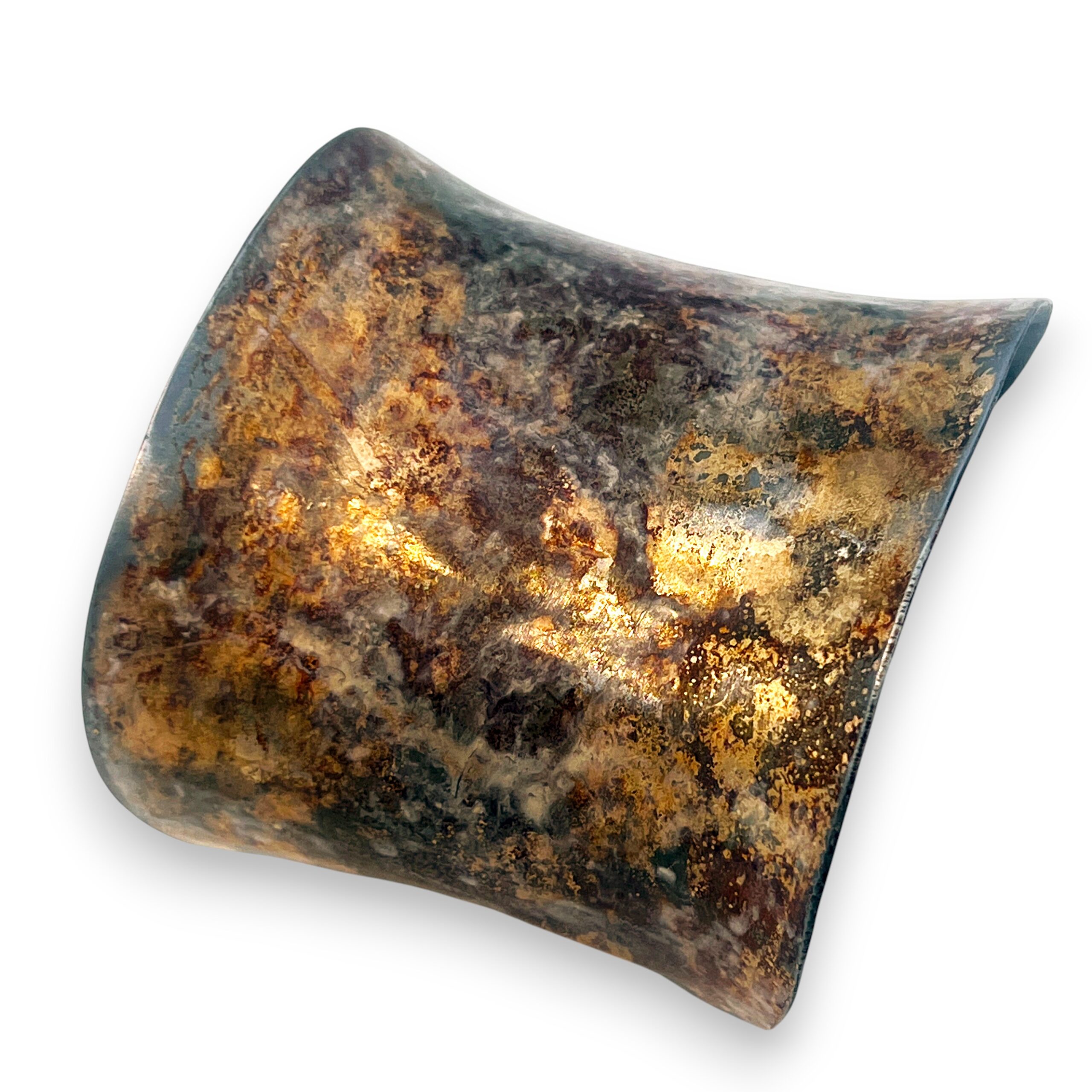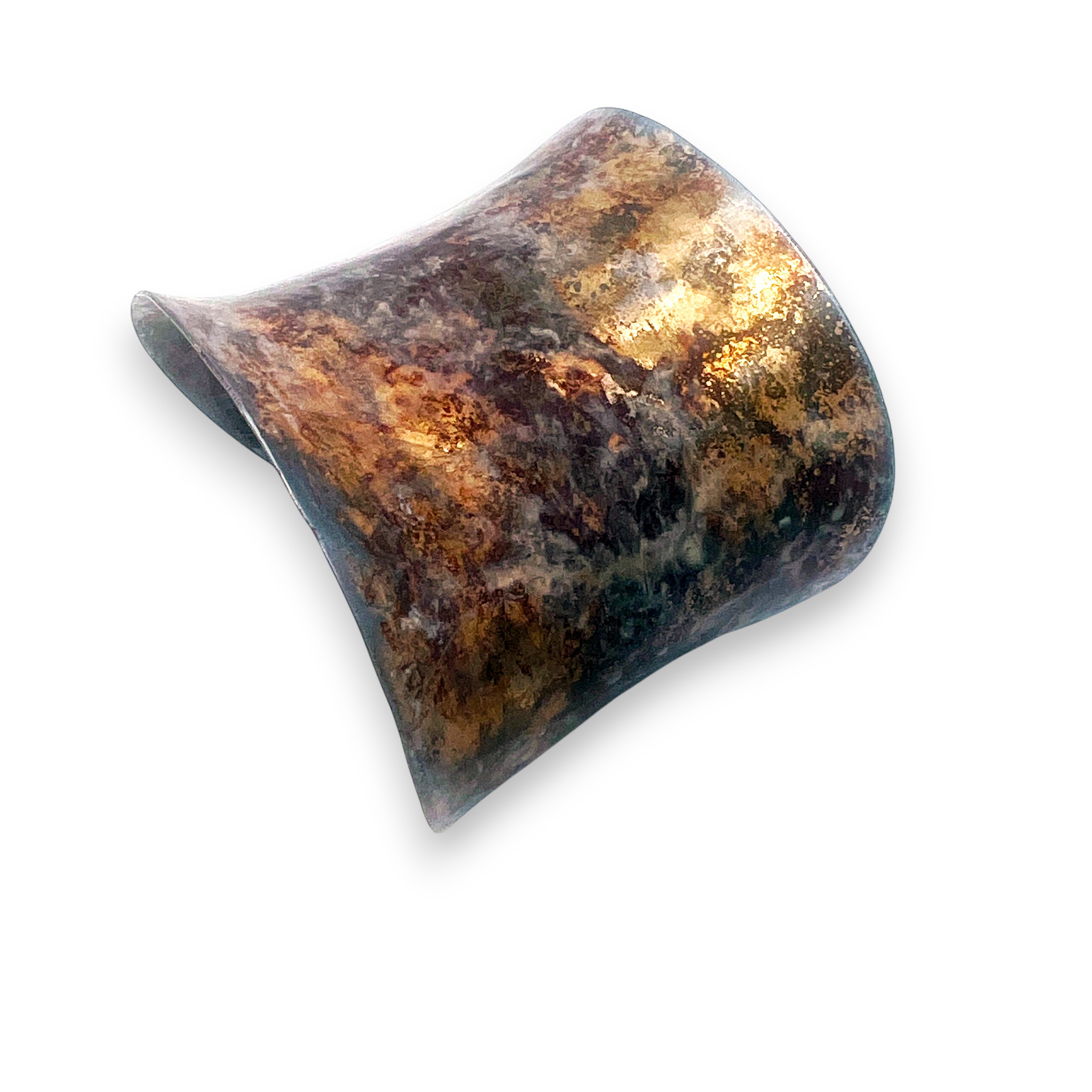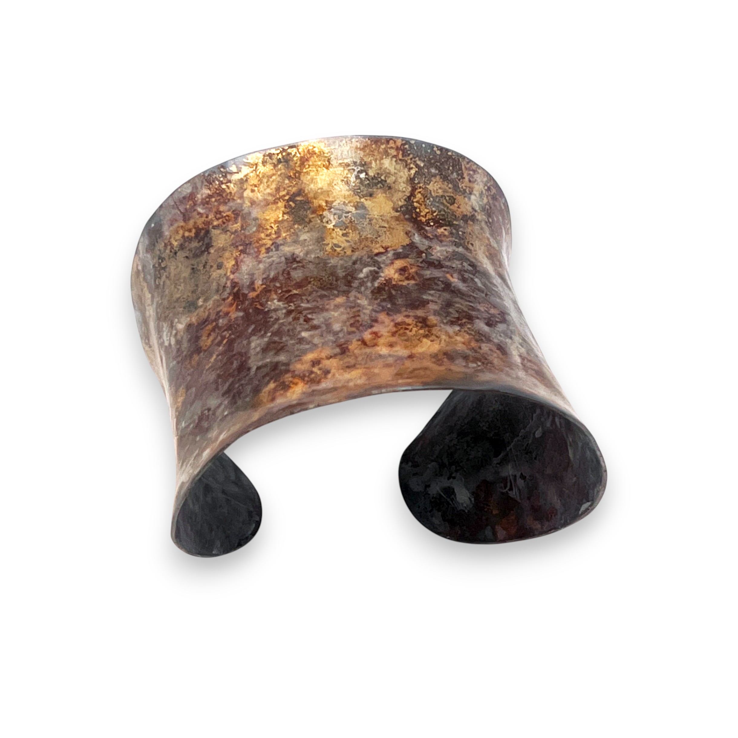 Kokoro (心) is a Japanese word that expresses the union of heart, mind, and spirit. This cuff reflects that inner state through layered patina, quiet gold, and a form shaped by tension and release. The bracelet celebrates the quiet drama of surface and form. Hand-formed from steel and fused with 18k gold, the piece is shaped into a graceful anticlastic curve that lifts and flares with a subtle, organic tension. The surface treatment is the true protagonist. A cold-applied Japanese Brown patina creates a richly variegated, rust-like ground, evocative of weathered stone and oxidized earth. This is layered with a sheer white solvent dye that softens and veils the darker tones, allowing flashes of gold to glow from beneath. A final application of white metal wax seals the surface and imparts a gentle, satin luminosity, enhancing the depth and movement of the finish. The result is a truly singular piece that serves as a canvas for nuanced color, light, and texture, and allows gold to emerge not as ornament, but as quiet radiance. product description goes here.