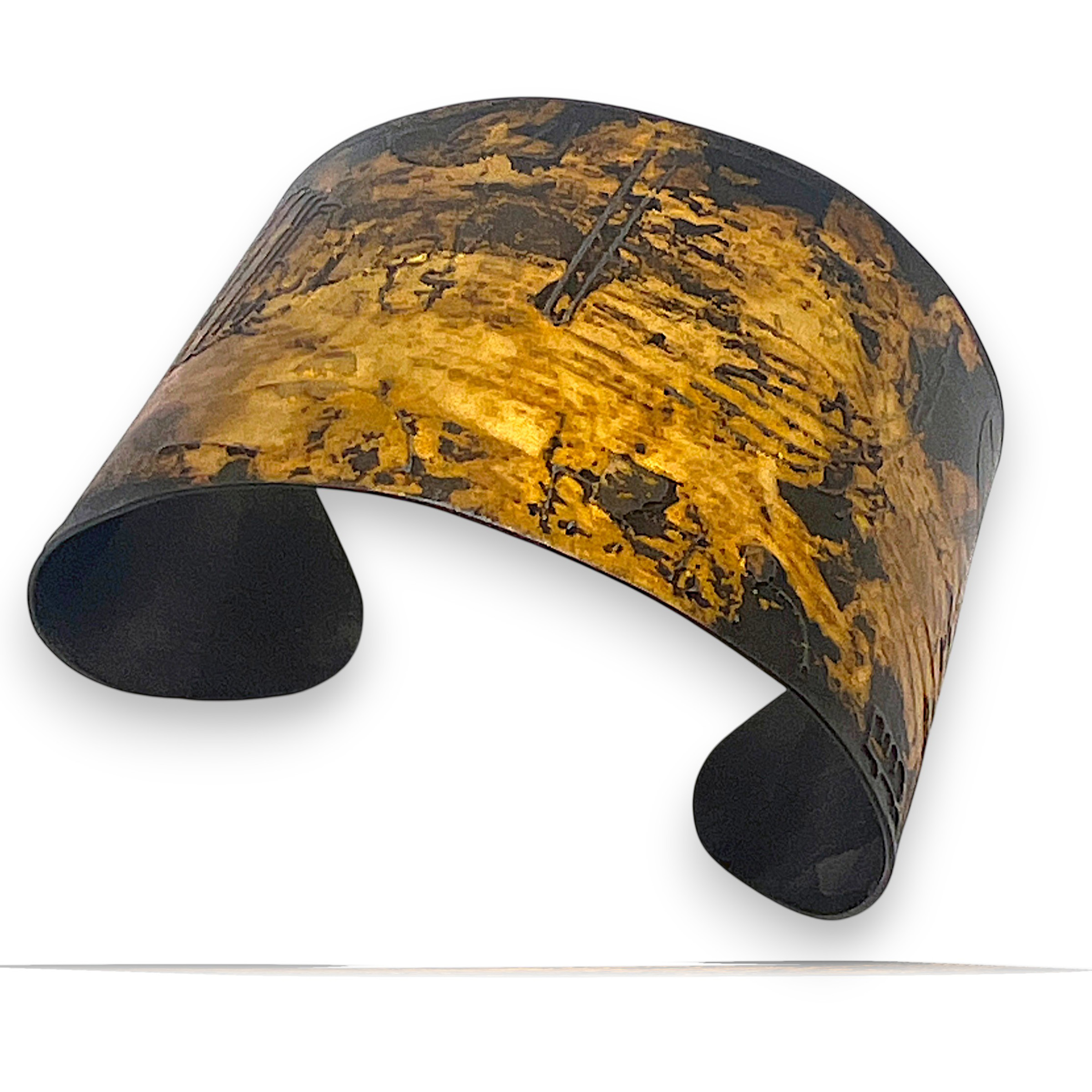 This bold steel cuff evokes the mystery of unearthed treasures. Etched with a pattern reminiscent of ancient hieroglyphs, its surface suggests the fragments of a long-buried script. The darkened steel provides a dramatic backdrop for luminous gold leaf, bonded across the etched textures like sunlight on golden treasure. At once contemporary and timeless, the piece captures an echo of civilizations past, reimagined for the present. 1 3/4" wide. Designed to fit an average size wrist with a 1 1/4' opening.